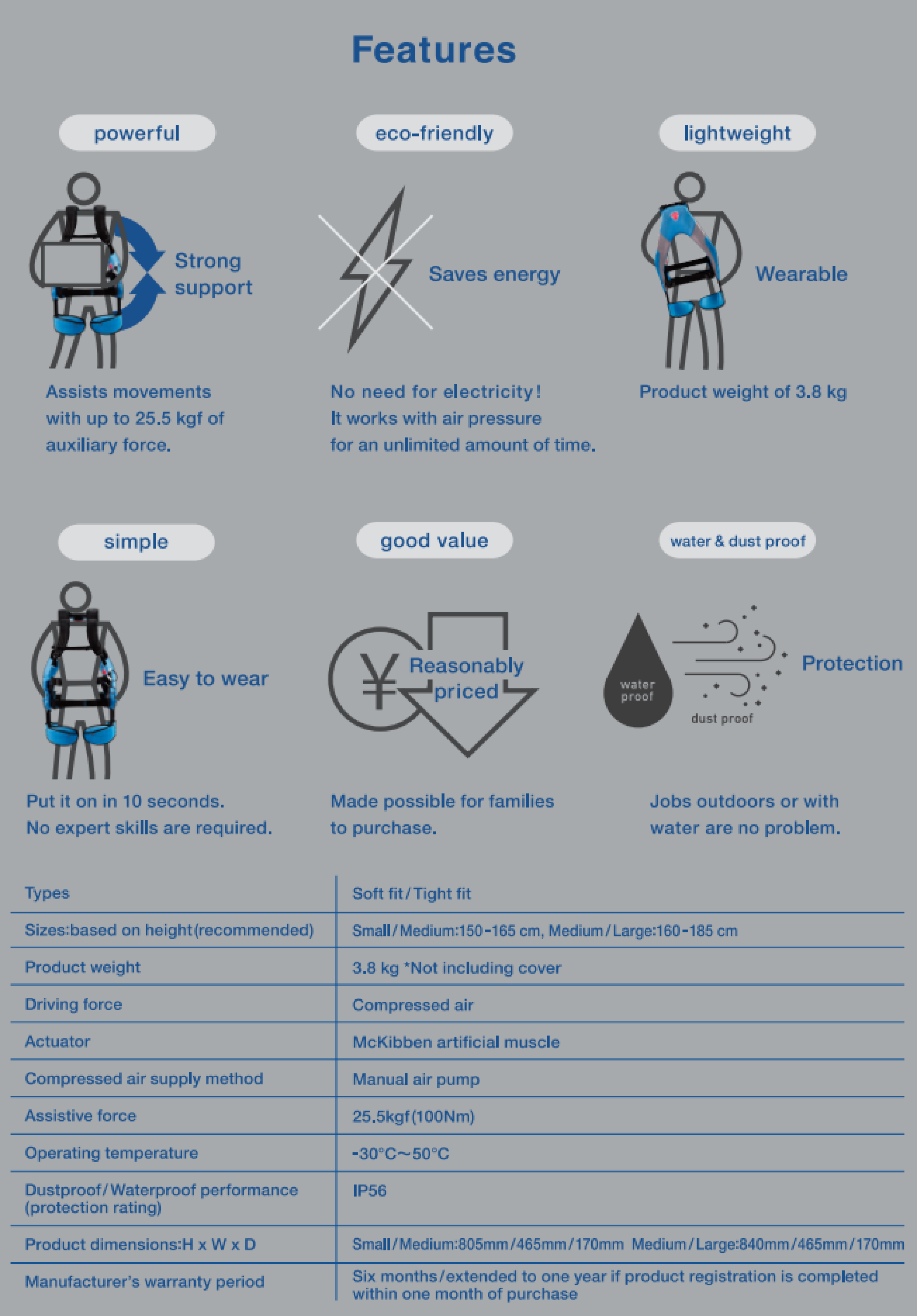 | 상세스펙 | 최대 보조력 25kgf IP 56 사이즈 Small/Medium 805mm * 465mm * 170mm Medium/Large 840mm * 465mm * 170mm | ||