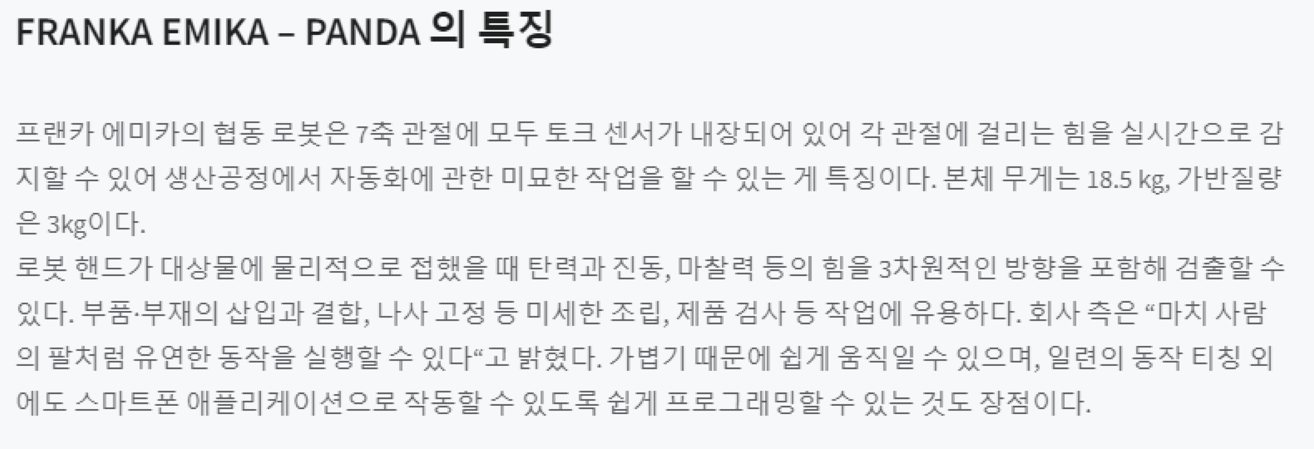 | 상품명(모델명) | FRANKA EMIKA PANDA(Payload : 3kg, Reach : 855mm) | ||
