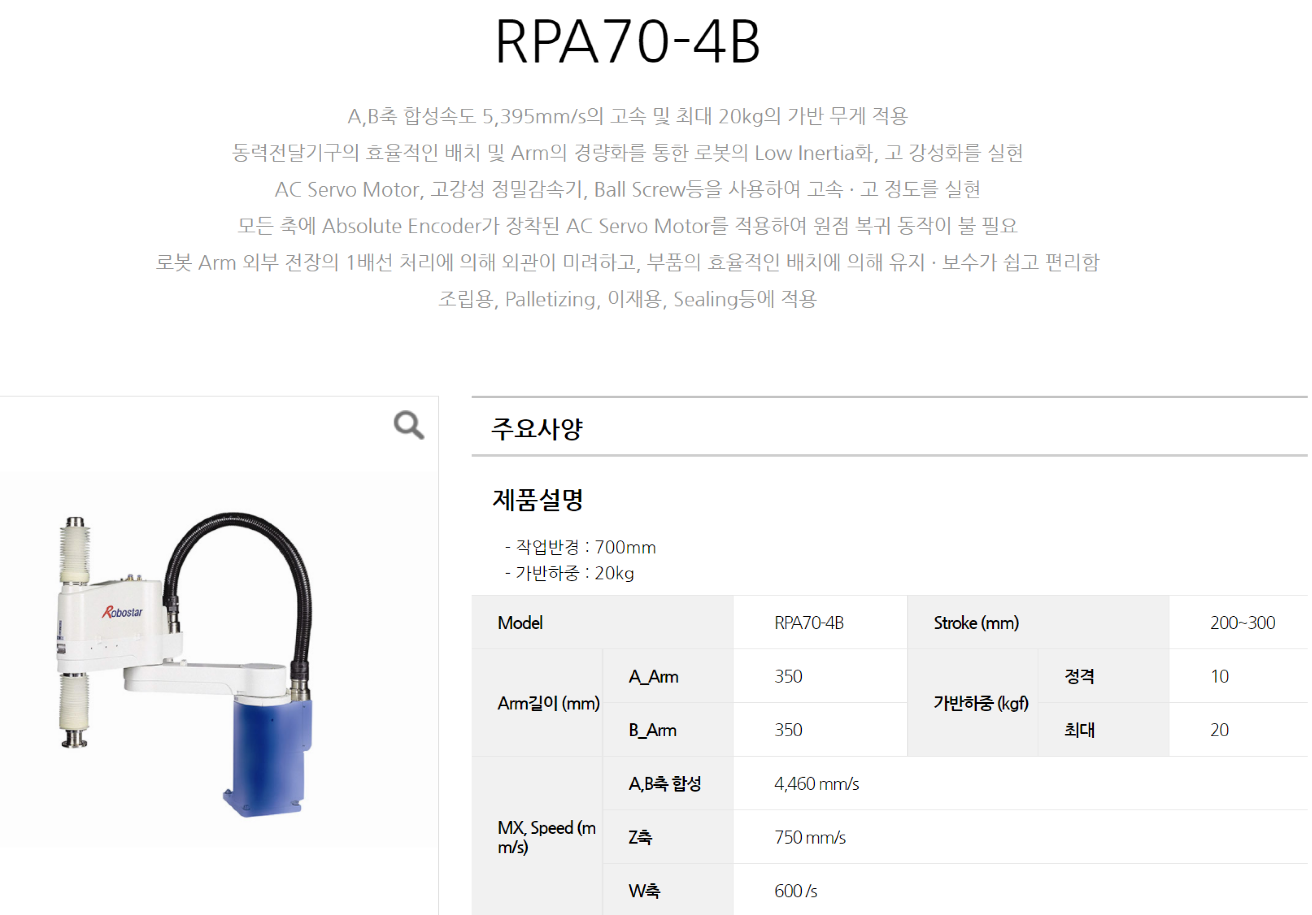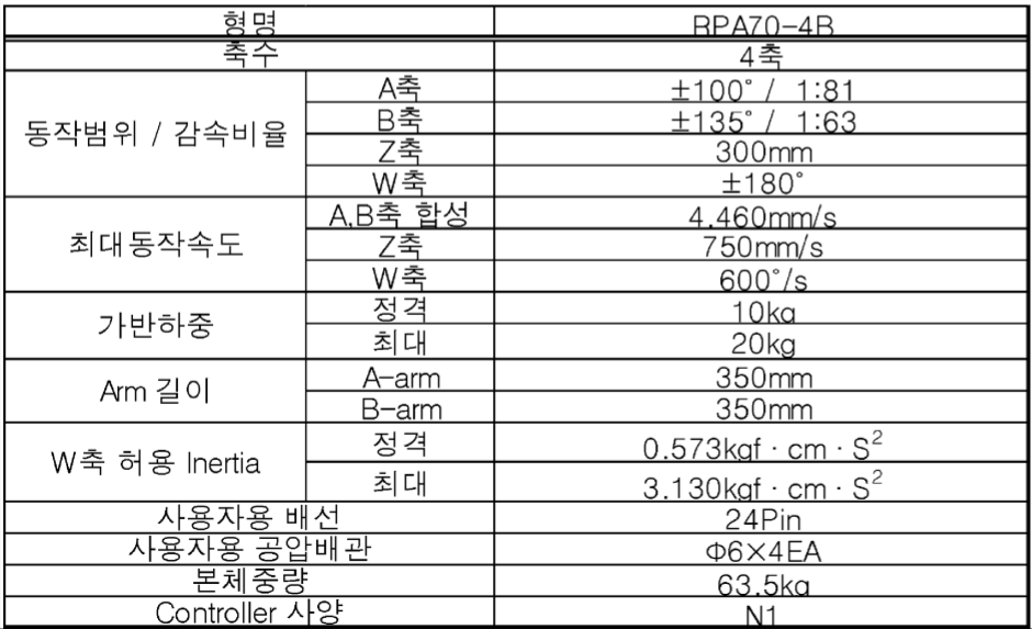 | 상품명(모델명) | 로보스타 RPA70-4B (Payload : 20kg, Reach : 700mm) | ||