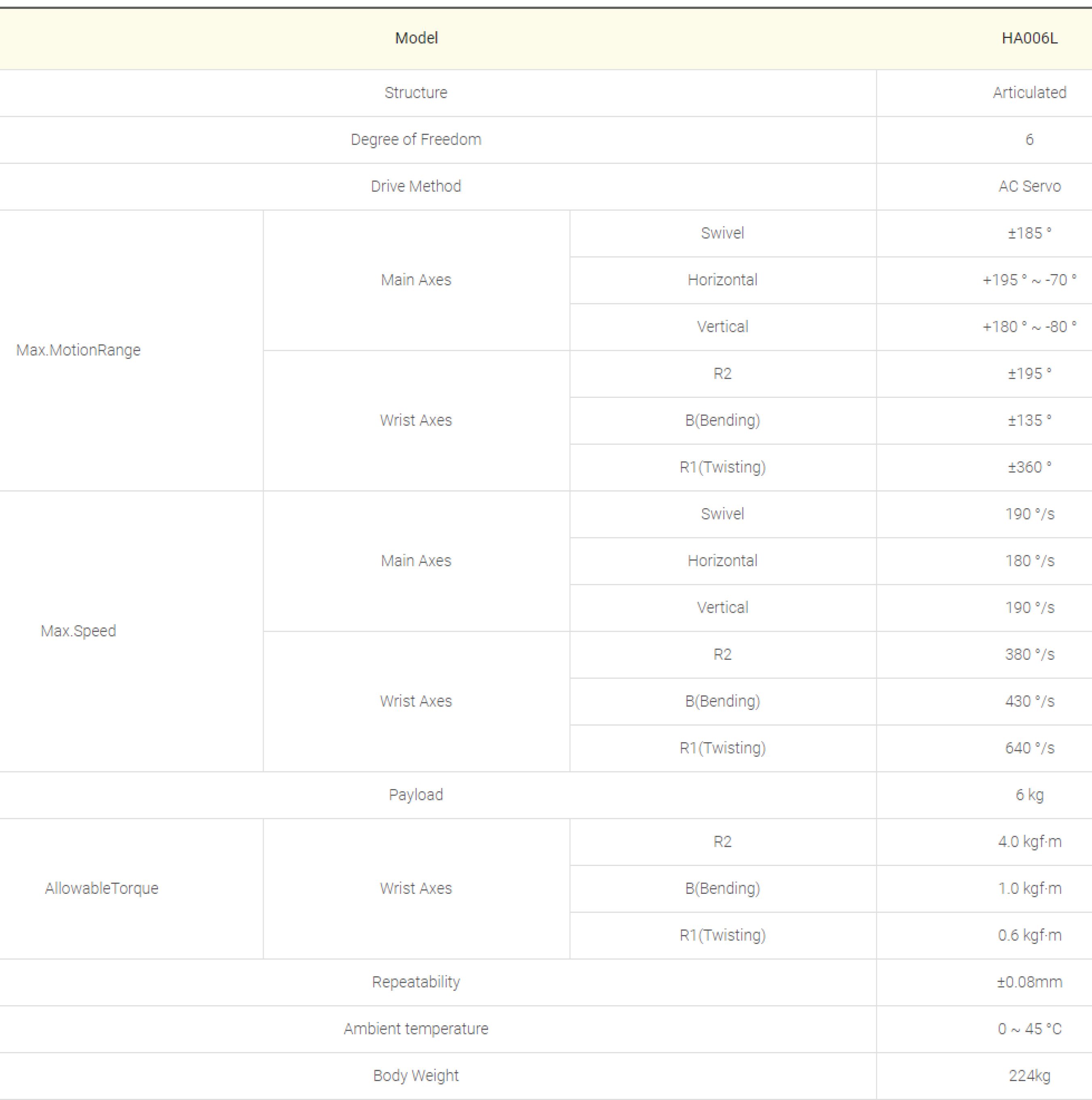 | 상품명(모델명) | 현대로보틱스 HA006L (Pay load : 6kg Reach : 1,994mm) | ||