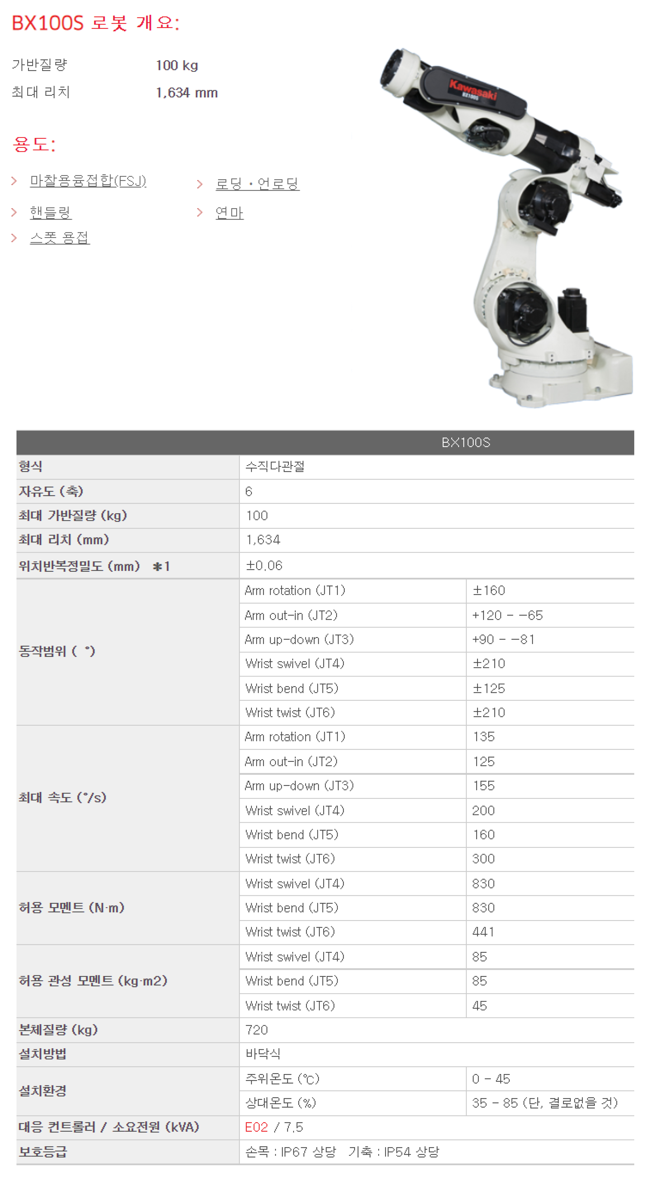 | 상품명(모델명) | Kawasaki 스폿용접용 BX100S (Payload : 100 kg , Reach: 1,634 mm) | ||