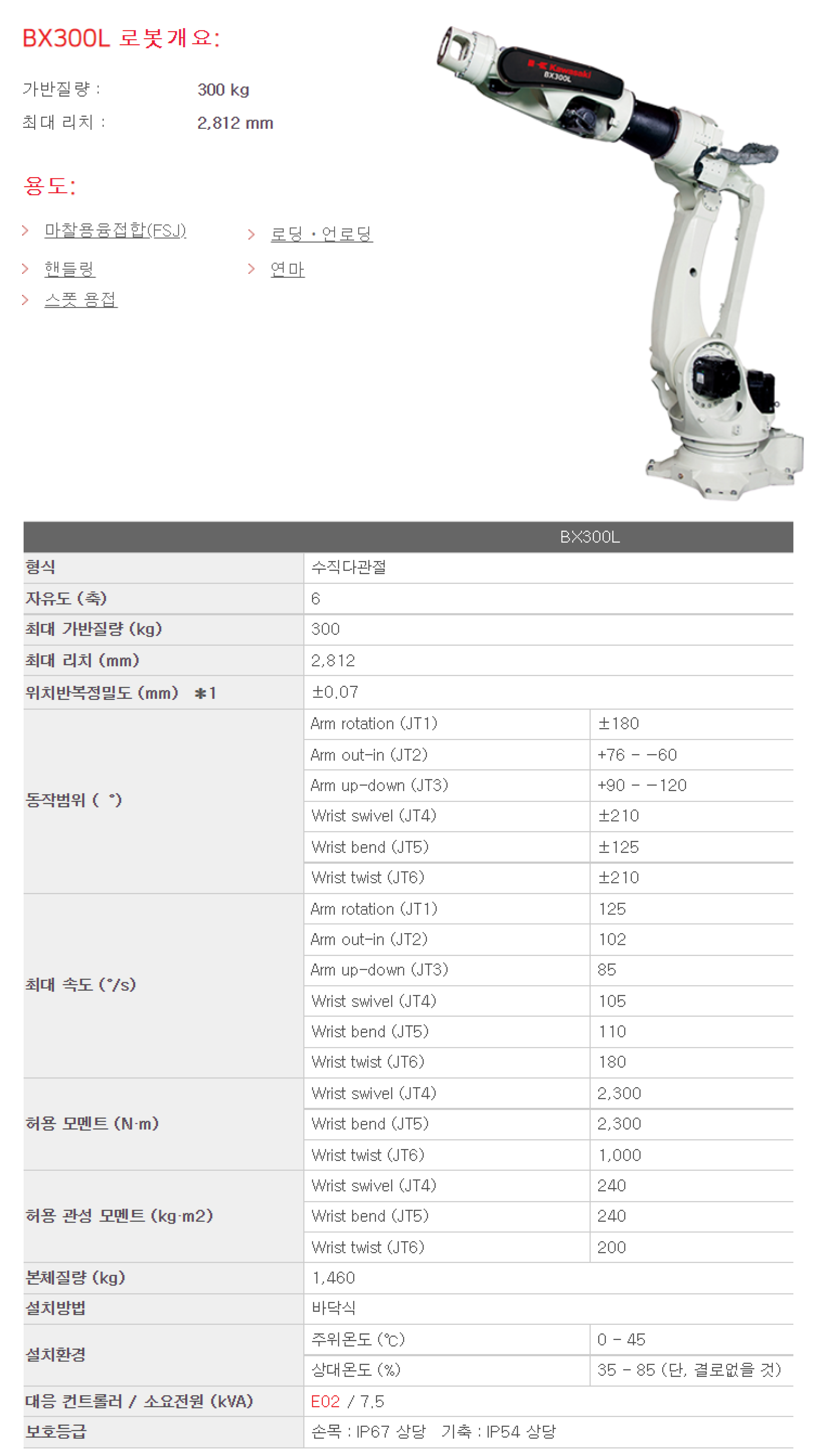 | 상품명(모델명) | Kawasaki 스폿용접용 로봇 BX300L (Payload : 300 kg , Reach: 2,812 mm) | ||