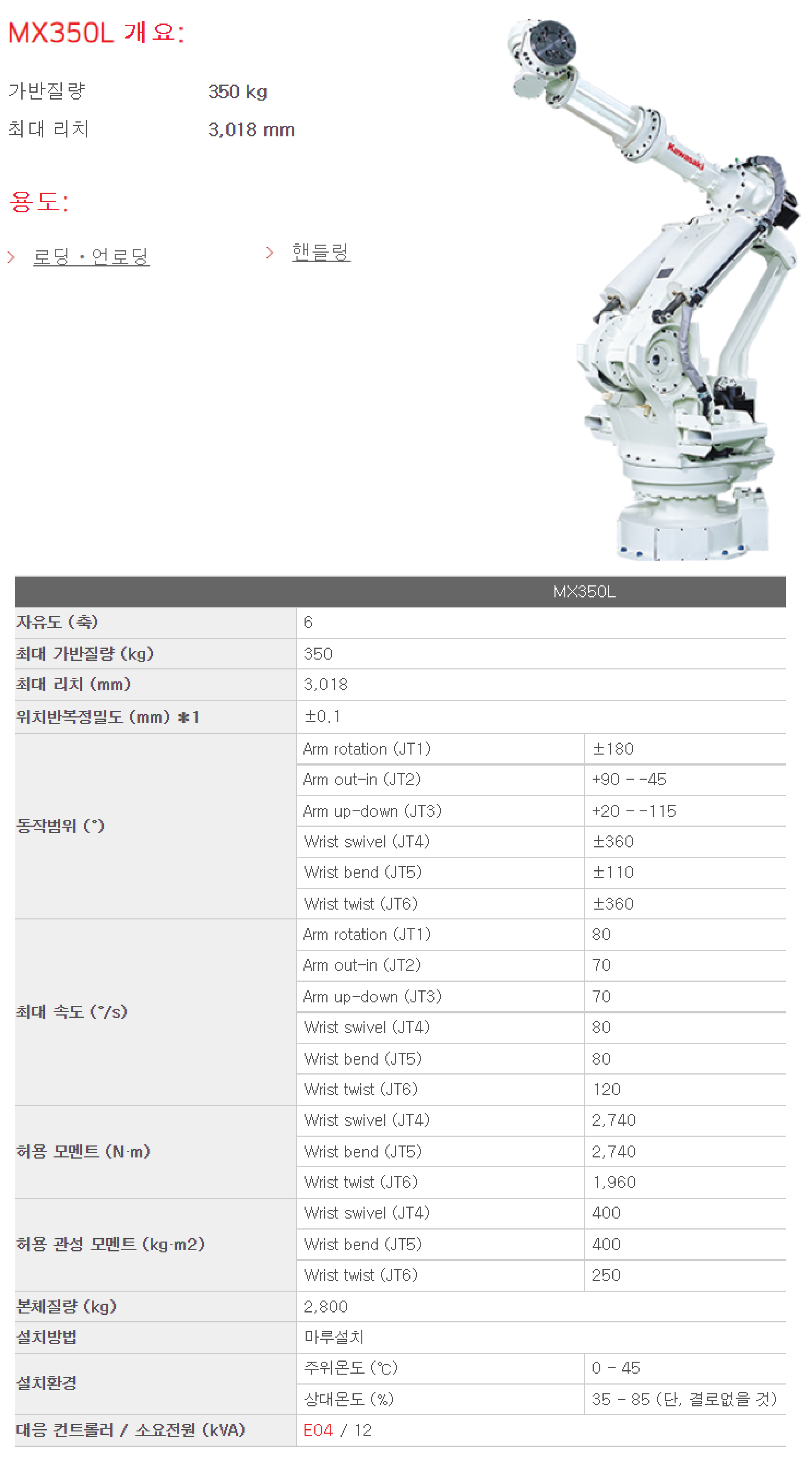 최대 가반 질량 350kg 컴팩트한 바디와 큰 손목 토르크가 장점입니다.