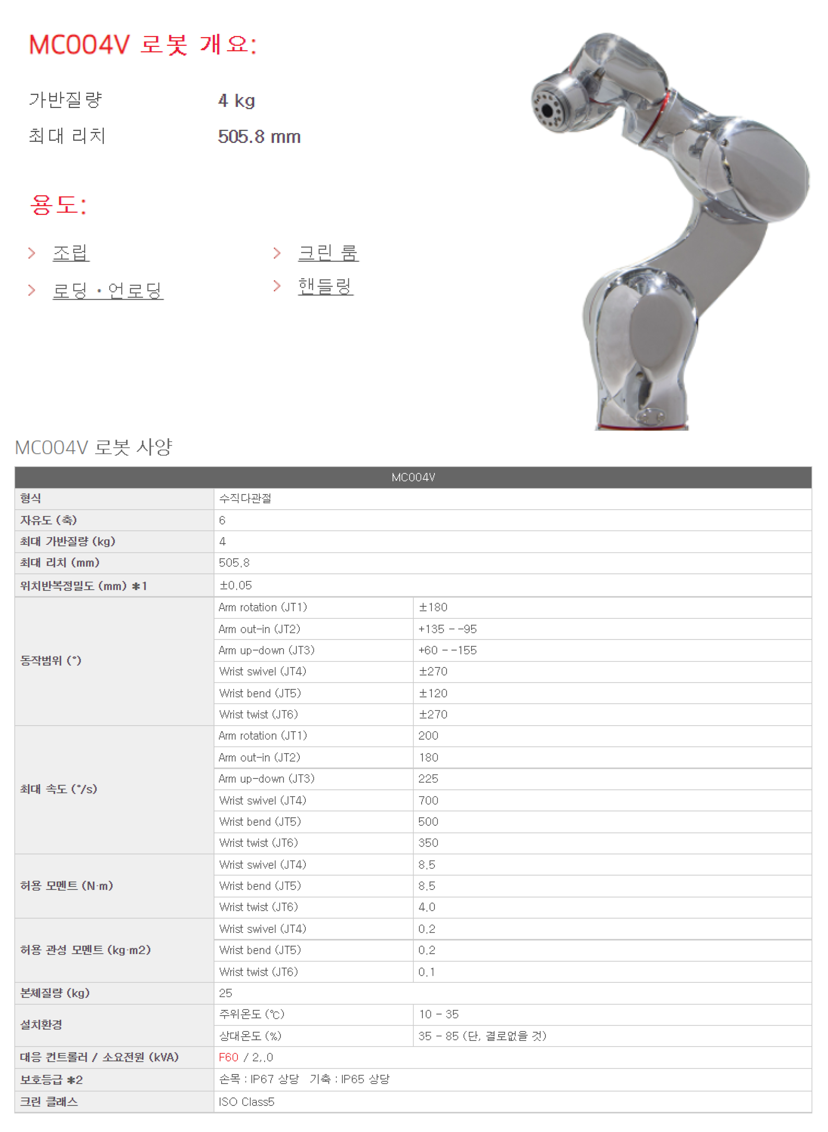 | 상품명(모델명) | Kawasaki 의료용 로봇 MC004V (Payload : 4 kg , Reach: 505.8 mm) | ||