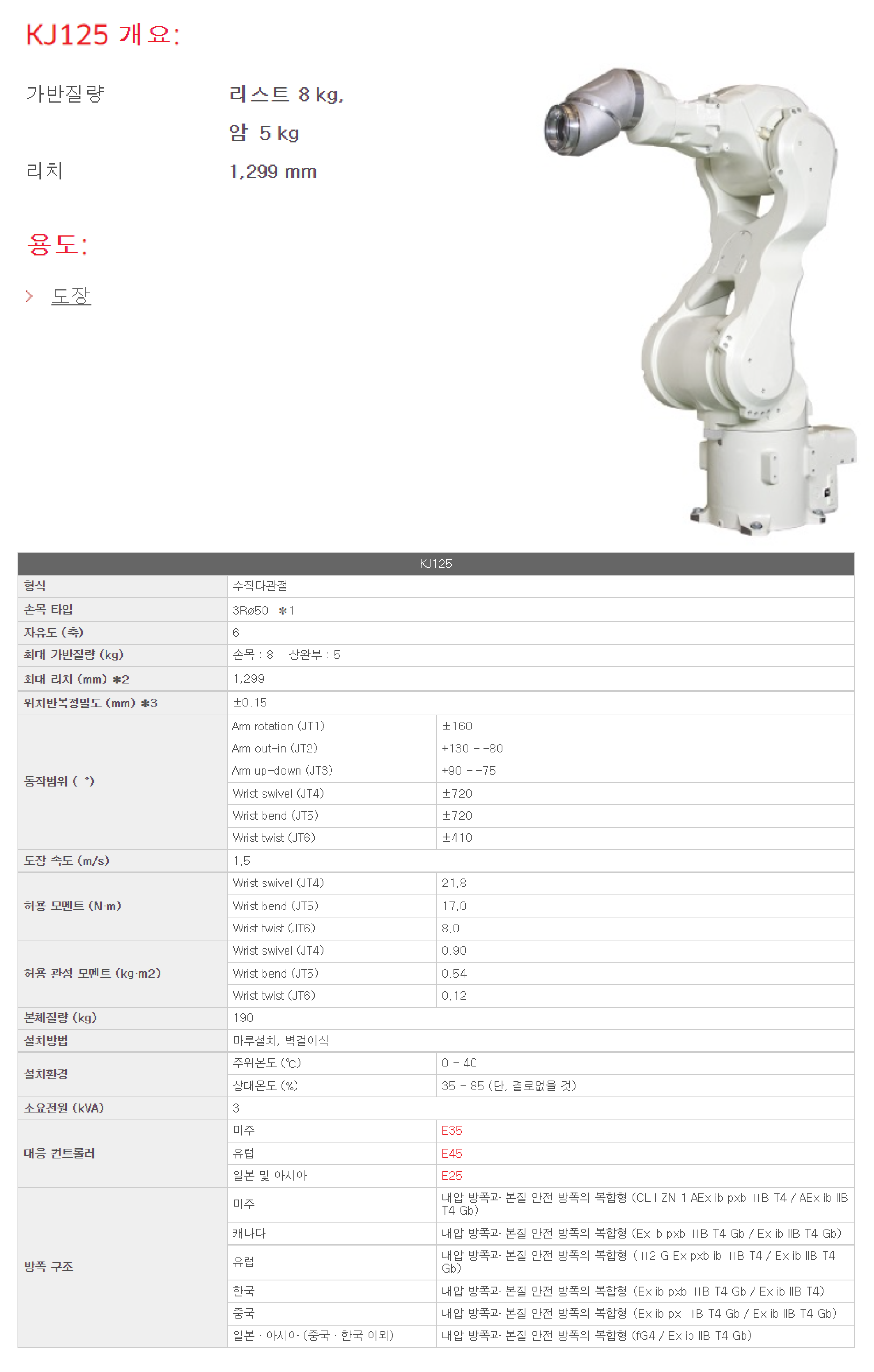 | 상품명(모델명) | Kawasaki 방폭도장로봇 KJ125 (Payload : 8kg , Reach: 1,299 mm) | ||