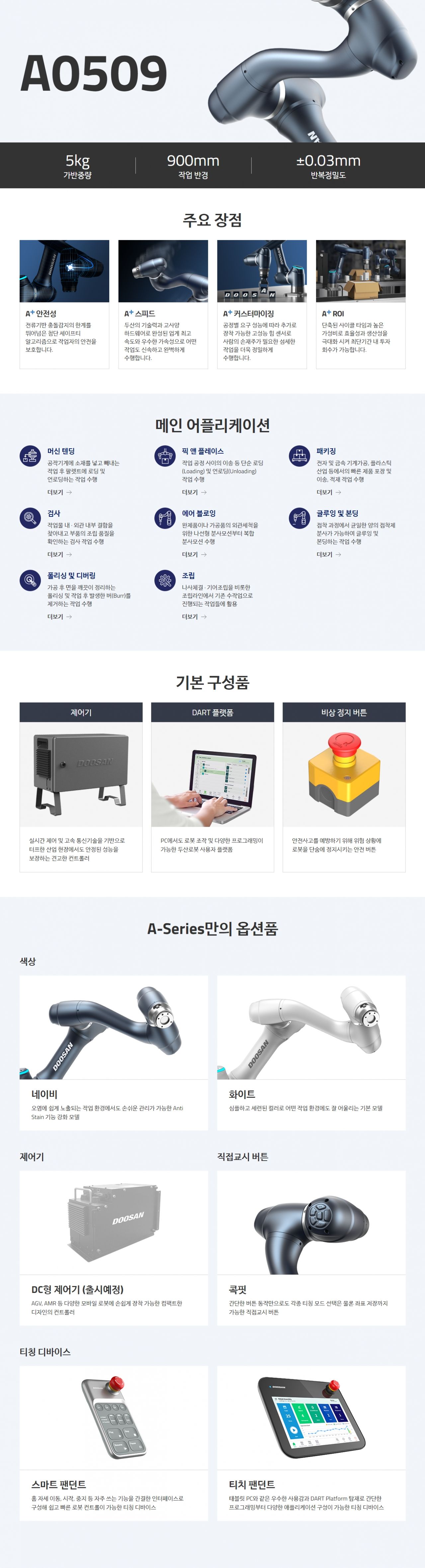 | 상품명(모델명) | 두산로보틱스 A0509 (Payload : 5kg, Reach : 900mm) | ||